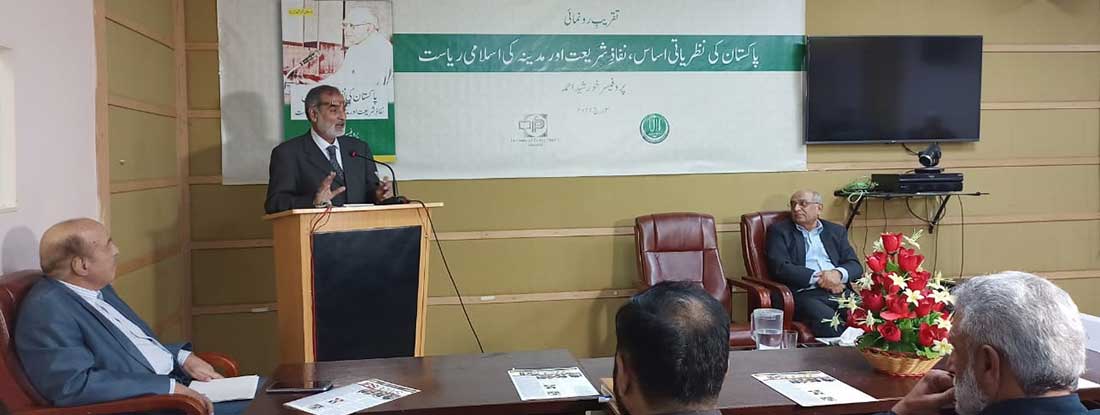 These thoughts were expressed unanimously by the speakers during the book launching ceremony of a recent IPS Press publication Pakistan Ki Nazriyati Asas, Nifaz e Shariyat Aur Madina ki Islami Riyasat. The book comes from a series of publications which compile the writings and speeches of the veteran politician and eminent scholar Professor Khurshid Ahmad on a variety of subjects of national significance.