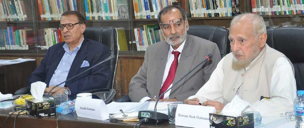 Held on October 13, 2018, the session chaired by Khalid Rahman, executive president & director general of IPS, was first addressed by the Institute’s founding chairman Professor Khurshid Ahmad via an audio link. The participants included Shamshad Ahmad Khan, former federal secretary, Ministry of Foreign Affairs, Ambassador (retd) Rustam Shah Mohmand, Saeed Ahmad Qureshi, fomer deputy chairman, Planning Commission of Pakistan, Masud Daher, former federal secretary, Fasih Uddin, former chief economist of Pakistan, Mirza Hamid Hasan, former secretary, Water and Power, Mufti Muneeb-ur-Rehman, president, Tanzeem-ul-Madaris Pakistan, Muhammad Qasim Bughio, ex-chairman, Pakistan Academy of Letters, Syed Abu Ahmad Akif, former federal secretary, Cabinet Division, Air Cdr (r) Khalid Iqbal, and Dr Syed M. Anwer, eminent jurist and member Islamic Ideology Council.
