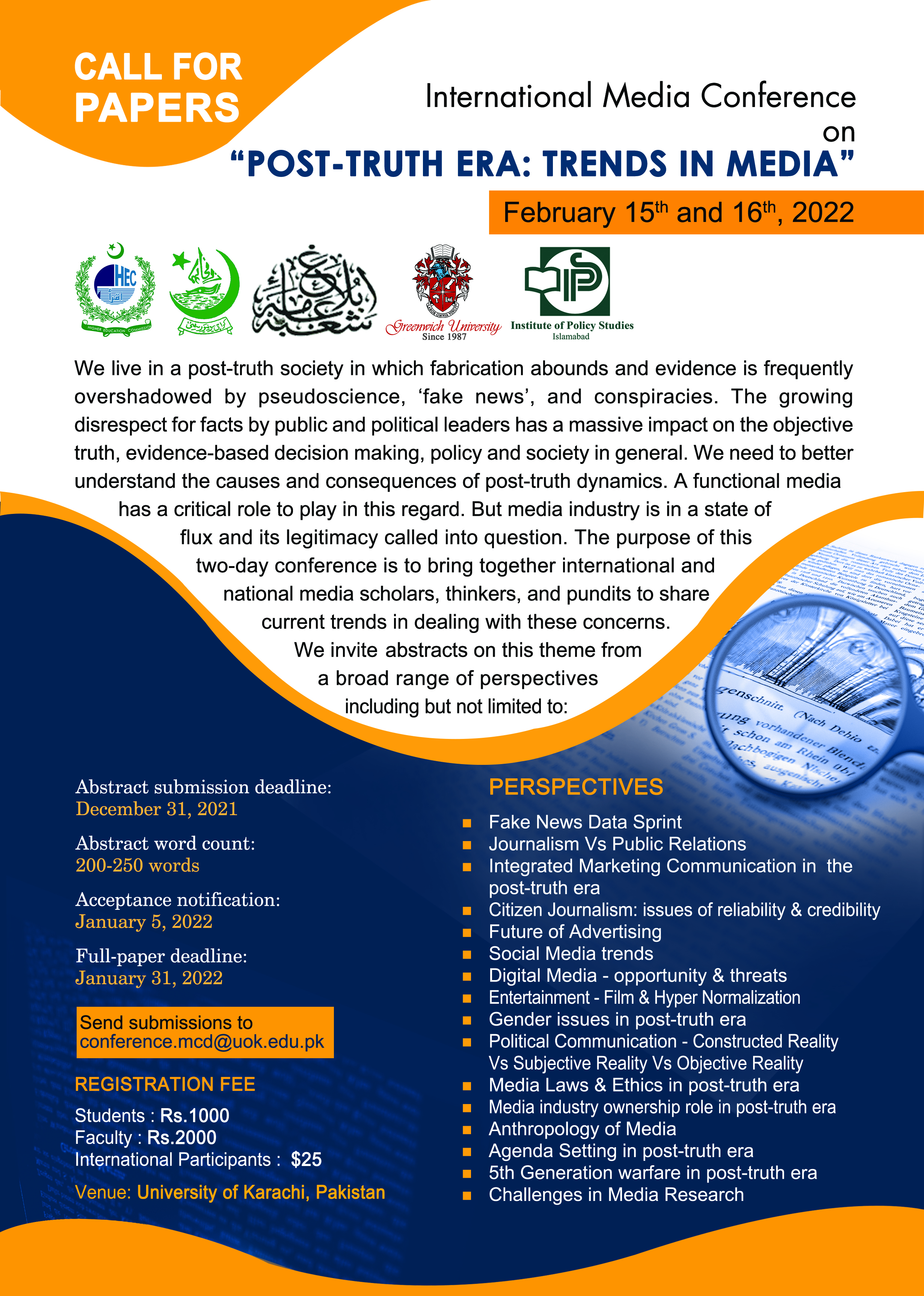 IPS is collaborating with the University of Karachi’s Mass Communication Department, Higher Education Commission (Sindh) and Greenwich University in co-organizing an international media conference titled ‘Post Trust Era-Trends in media’ which is scheduled to be held on February 15-16, 2022 in Karachi.
