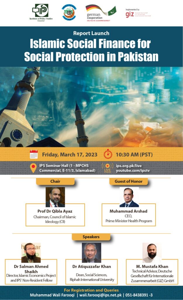 Institute of Policy Studies (IPS), in collaboration with Deutsche Gesellschaft für Internationale Zusammenarbeit (GIZ) GmbH and the Council of Islamic Ideology (CII), is launching a report titled ‘Islamic Social Finance for Social Protection in Pakistan’ on Friday, March 17, 2023, at 10:30 AM PST.